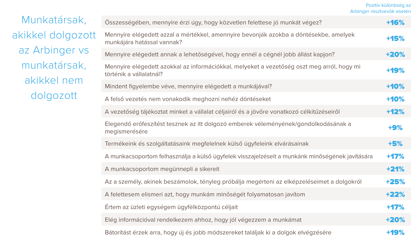 A vállalat munkavállalói felmérése segített számszerűsteni az Arbinger által végzett munka hatását. Összehasonlították azoknak a válaszait, akik részt vettek Arbinger tréningen, azokéval, akik nem. Attól függetlenül, hogy ezt a felmérést több mint egy évvel az Arbinger beavatkozás után készítették, az összes kérdésre sokkal kedvezőbben válaszoltak azok, akik dolgoztak az Arbingerrel (lásd alább a táblázatot). A tréning eredményeképp, annak ellenére, hogy az átalakítás nehézségeivel néztek szembe, a munkacsoportokban nőtt a produktivitás, és az ügyféligényeket megfelelően vették figyelembe és teljesítették. Az egyik regionális operatív vezető például megjegyezte, hogy „Nem hiszem, hogy az Arbinger tréning nélkül képes lennék rábírni az embereimet a megfelelő munkavégzésre ebben a helyzetben. De annak ellenére, hogy az újratervezési döntéseket nem tudom befolyásolni, nagyon jó dolgokat csinálunk.” Ezt nem csak az egyes egységekben érezték, hanem az egész divízióban is, amit az egyik vállalati tisztségviselő így fogalmazott meg: „Most sokkal több mindent elvégzünk és sokkal gyorsabban.”