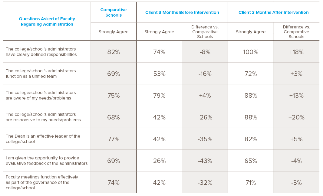 A university at which there was tremendous animosity and mistrust between the dean and the faculty called Arbinger in for help. The faculty’s unhappiness was reflected in a survey conducted in February 2011. Arbinger consultants worked with the faculty and administration in May 2011, with the objective of resolving these issues. The work with Arbinger led to a tremendous improvement, as evidenced by the results of the same survey conducted in August 2011, three months after the intervention. The faculty satisfaction scores went up from an average of 51.1% to 80.9%, moving from 23 percentage points below the faculty results from comparative schools to almost seven percentage points above the results from the comparative schools.